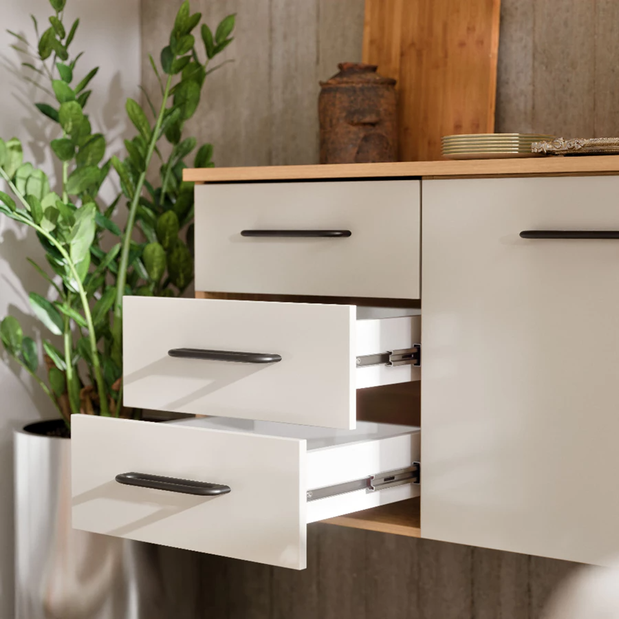 Gavetas que Deslizam: Esqueça gavetas que travam. Com as corrediças telescópicas, você tem abertura total e um deslize silencioso e macio.