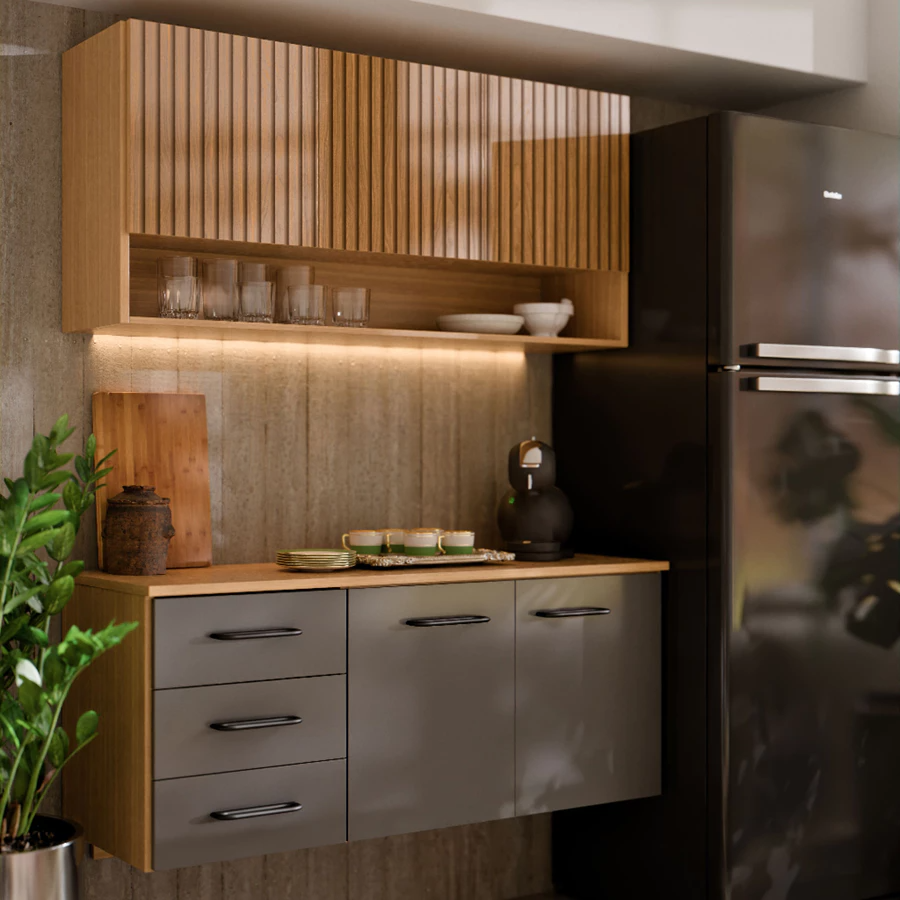 O Armário de Cozinha Eliza une a sofisticação do acabamento ripado 3D (tendência absoluta em design de interiores) com a resistência que o dia a dia exige. Construído em um mix de MDP/MDF, ele oferece a estrutura robusta que você precisa para organizar sua rotina.