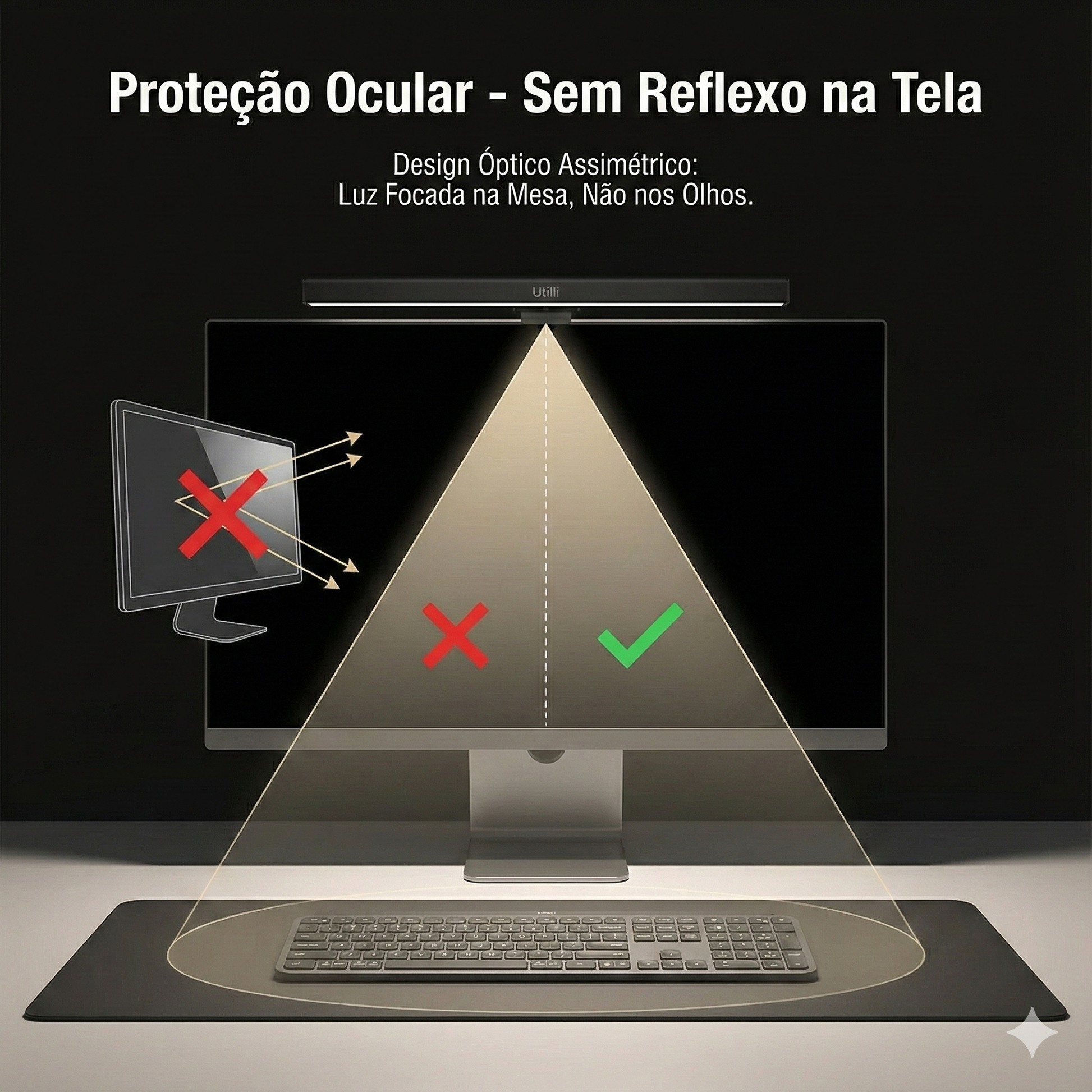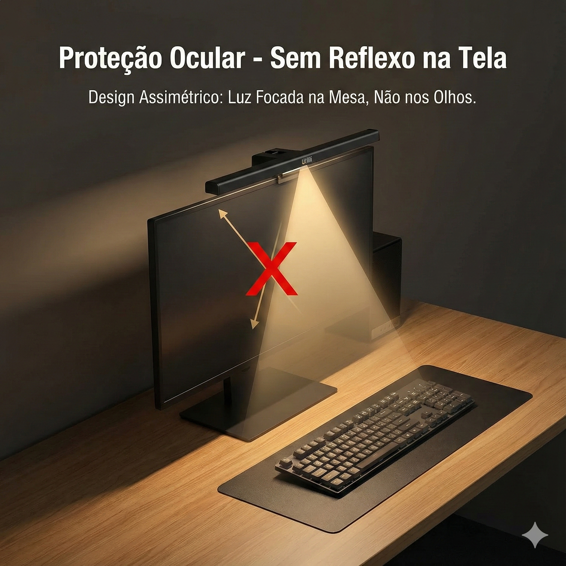 Zero Reflexo na Tela: Graças ao design óptico assimétrico, a luz atinge apenas a mesa, eliminando o brilho ofuscante no monitor que causa fadiga ocular.