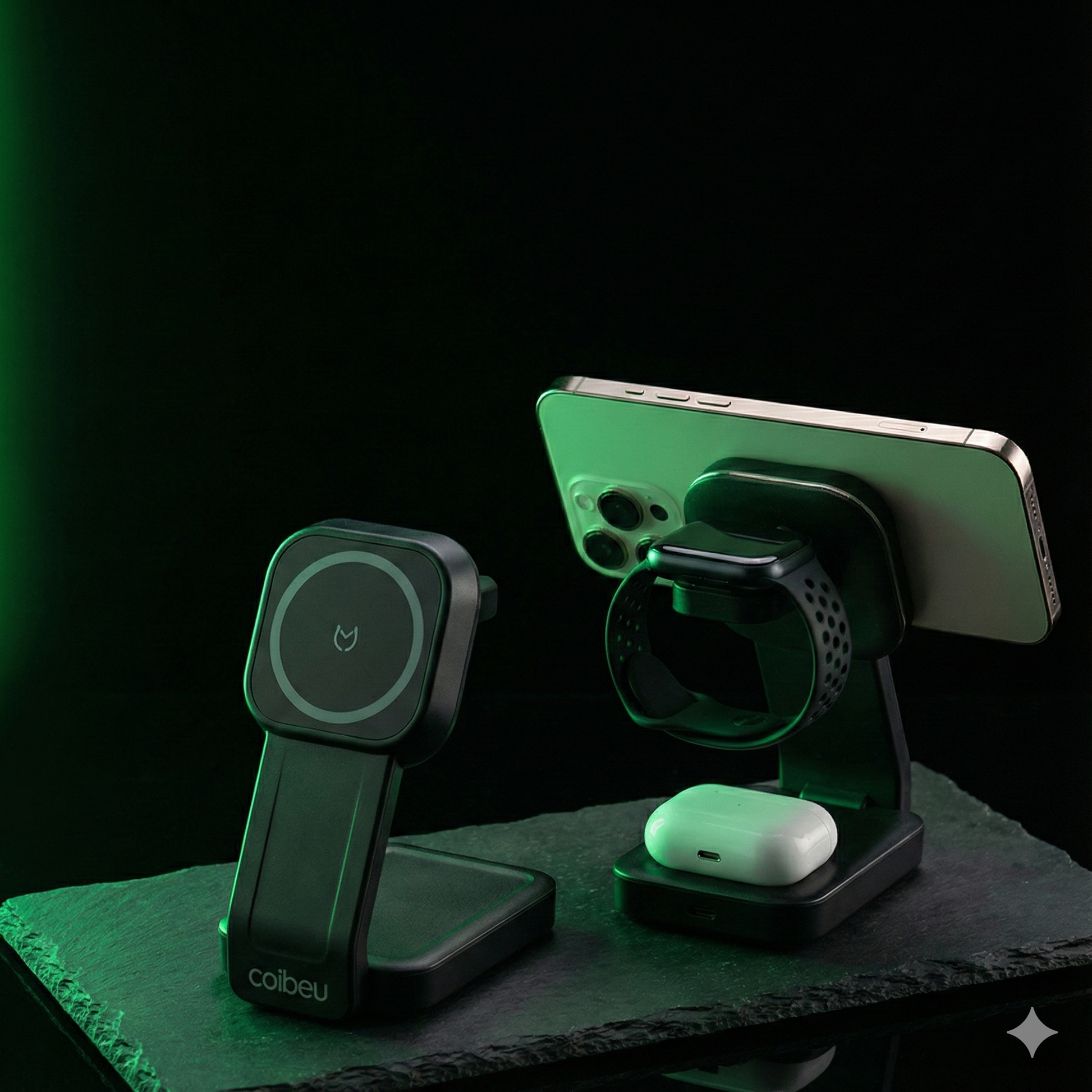 Um único dispositivo, potência tripla. Com tecnologia de indução inteligente, você carrega seus três dispositivos essenciais ao mesmo tempo, com total segurança e velocidade:
