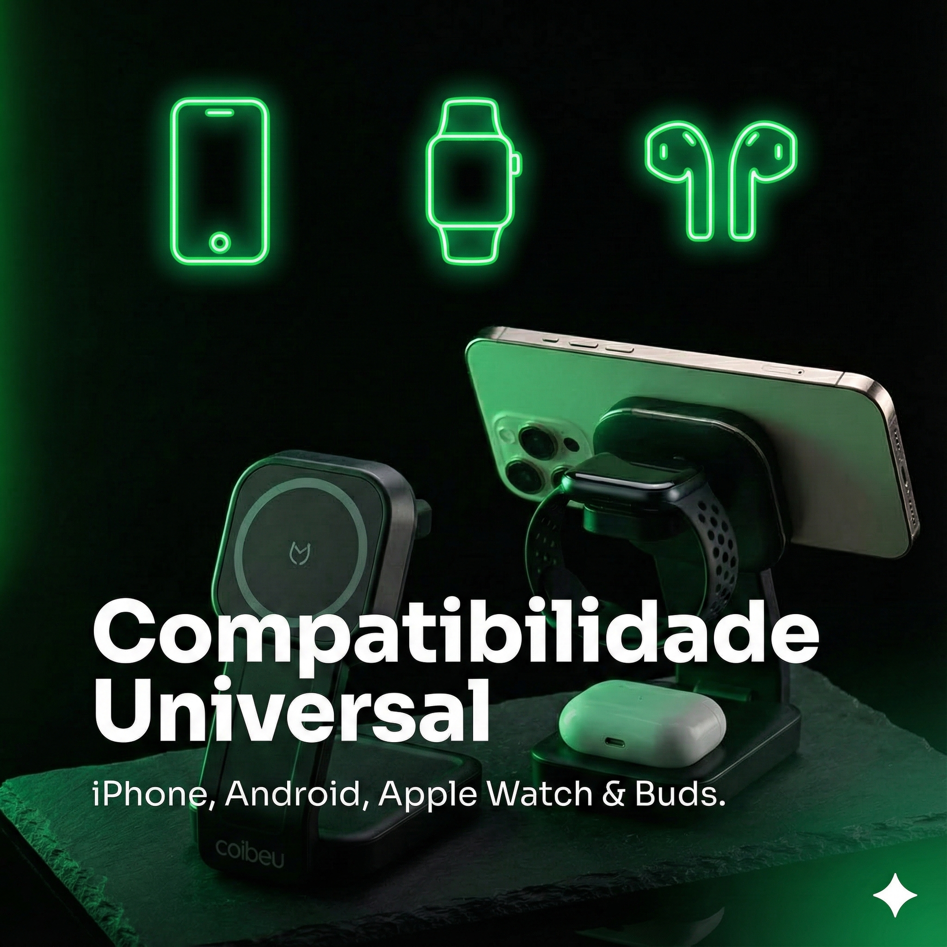 ⚡ Smartphone: Compatível com iPhone (MagSafe) e Androids com carregamento sem fio.